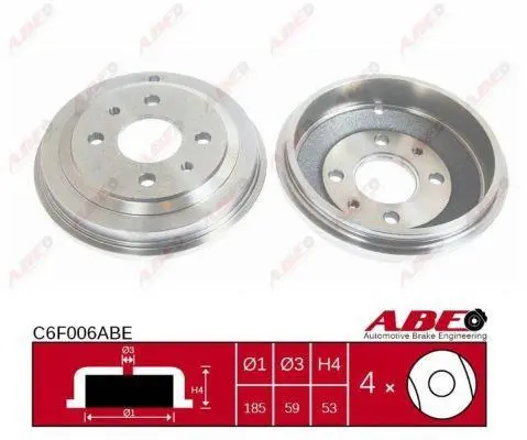C6F006ABE ABE Гальмівний барабан задн FIAT 147, CINQUECENTO, DUNA, ELBA, FIORINO, PALIO, PENNY/KOMBI, SEICENTO / 600, SEICENTO / 600/HATCHBACK, SIENA 0.9-Electric 07.84-01.10 задний мост