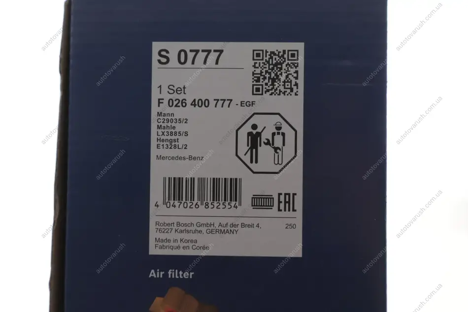 F 026 400 777 BOSCH Фільтр повітряний MB C-class (W204)/E-class (W212/W213)/S-class (W221/W222) 3.0CDI OM642 07-18 (к-кт)