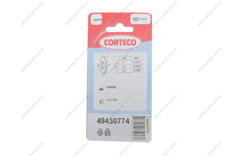 49430774 CORTECO Шайба під форсунку Honda Accord/Civic/CR-V/FR-V 2.2 CTDi 04- (7.1x15x2.5) (к-кт 4шт)