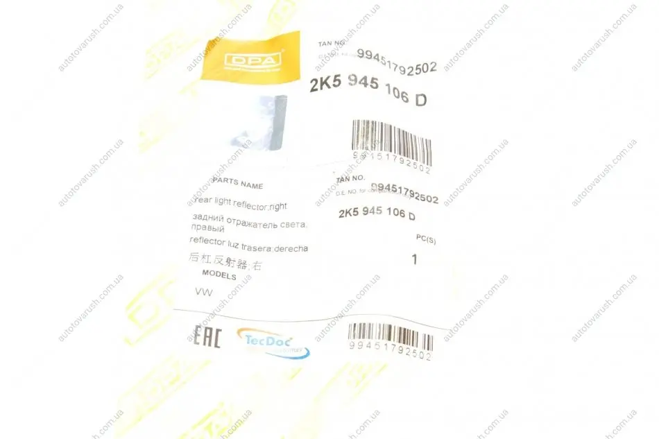 99451792502 DPA Световозвращатель бампера (заднего) VW Caddy IV 15-20 (R) справа
