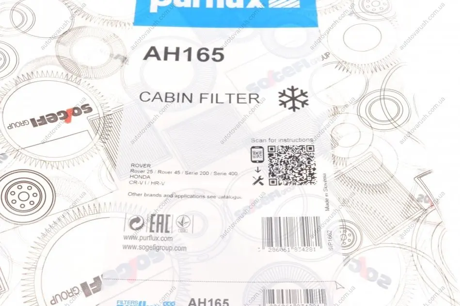AH165 Purflux Фильтр салона Honda Civic VI 1.6 16V 98-01
