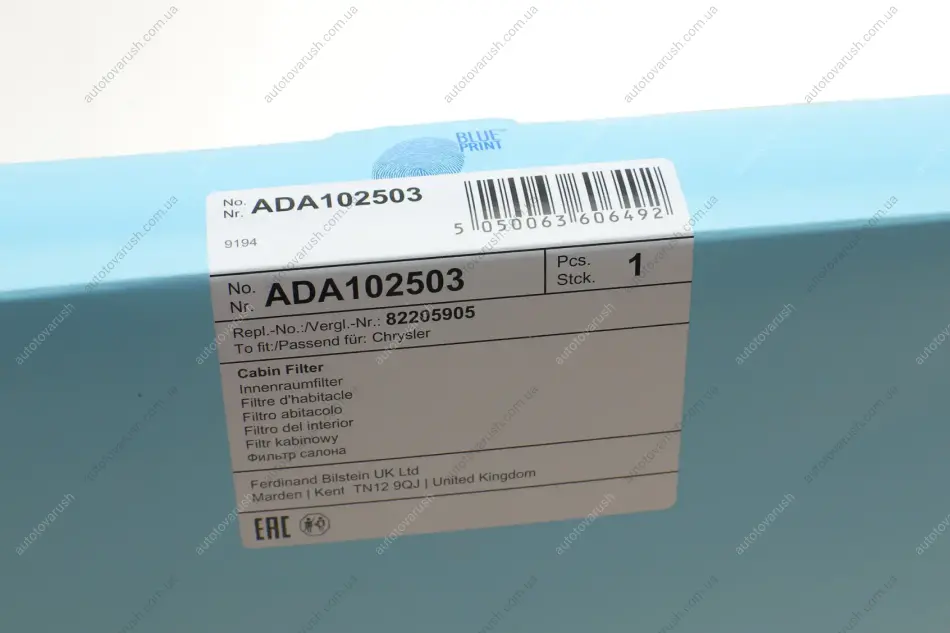 ADA102503 BLUE PRINT Фільтр салону Chrysler Voyager/Grand Voyager 00-08 (вугільний)