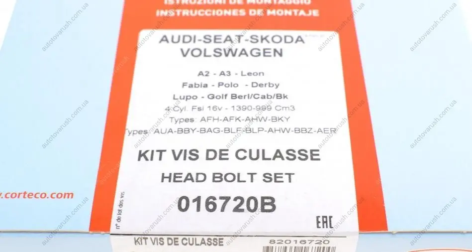 016720B CORTECO Комплект болтів, головка циліндра